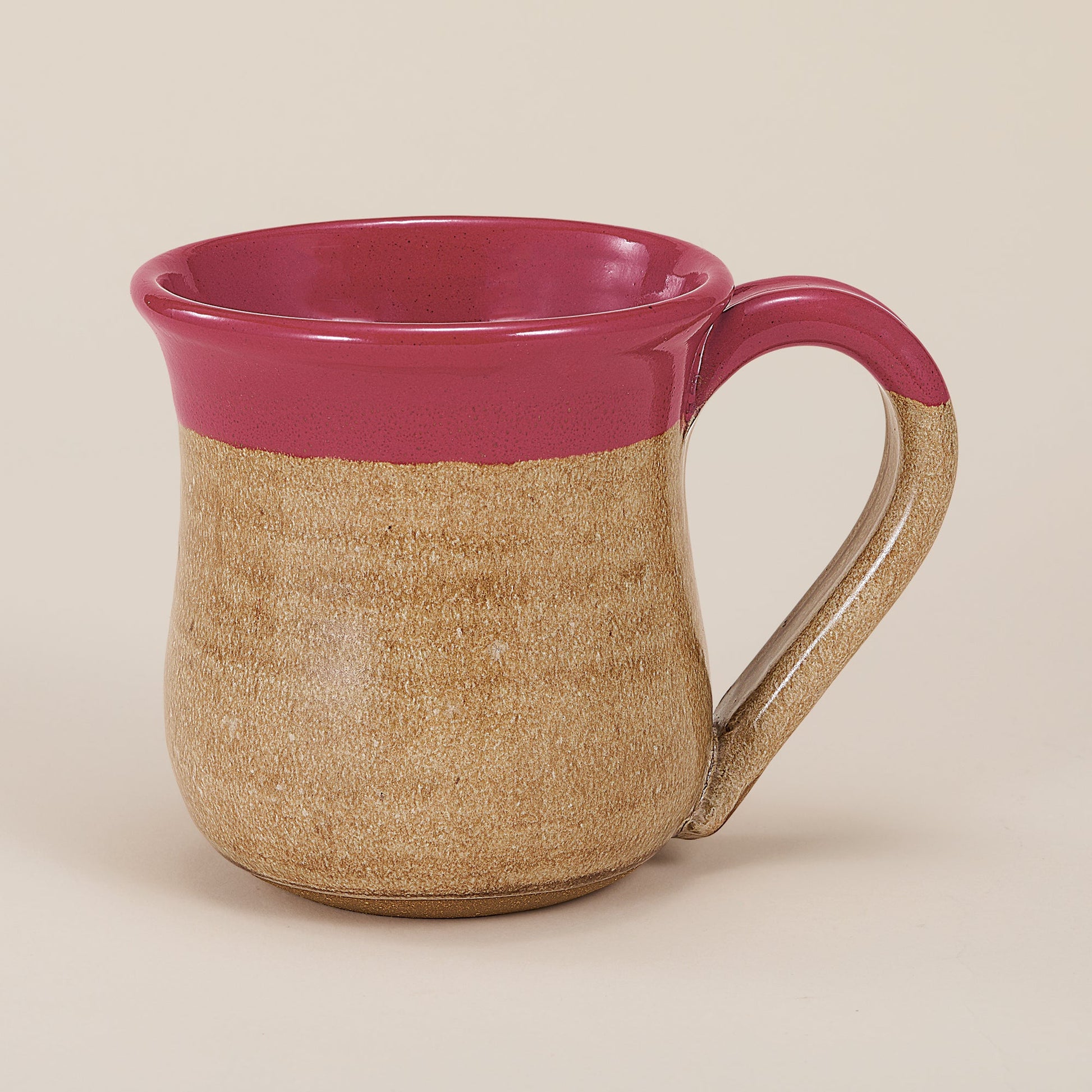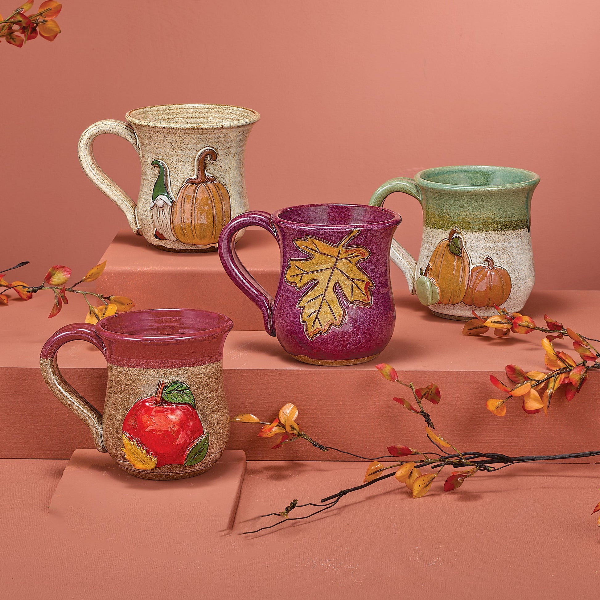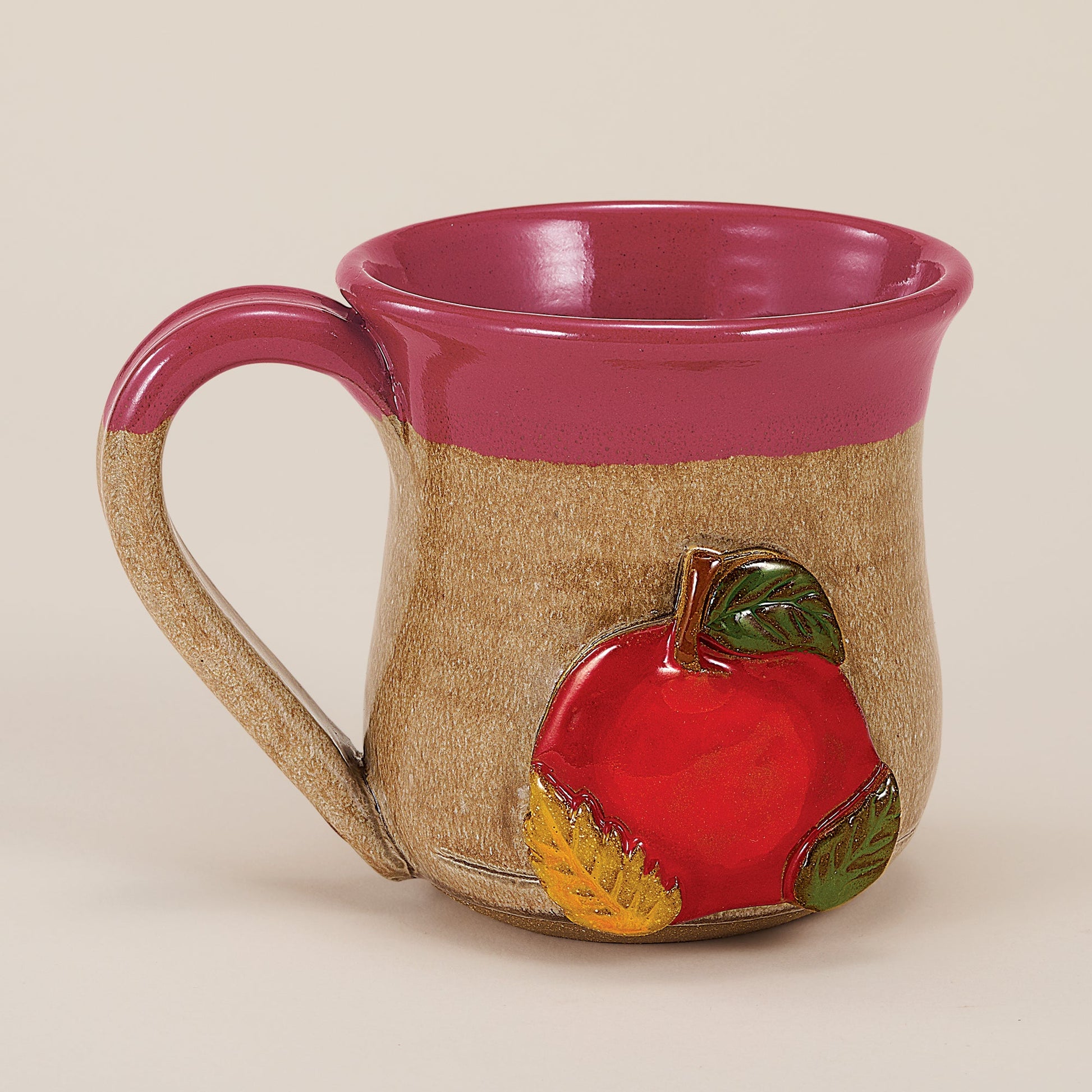 Hand-thrown on a pottery wheel by JoAnn of the Poconos, the top portion of this stoneware mug is dipped in a rustic red, with a natural effect on the bottom portion. A hand cut apple motif with colorful leaves, looks like it was just picked off the branch. Handcrafted exclusively for Uno Alla Volta, from the hearts and hands of artisans. Microwave, dishwasher and food safe. Approx. 5'' tall, holds 14 oz.