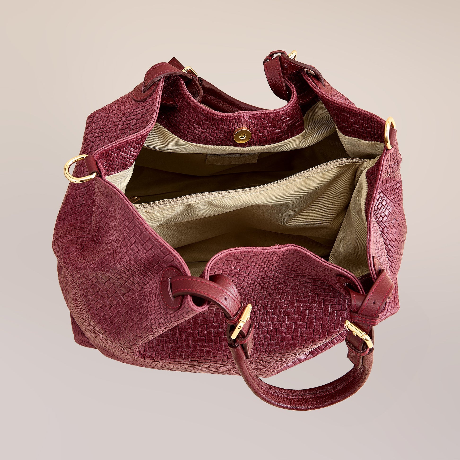 In Florence, our Italian leather craftsman Marco works with the supplest Italian leather, in a rich burgundy, to handcraft this oversized woven-inspired design handbag. Generously-sized this bag is excellent for work or travel. Approx. 16'' x 7'' x 12.5'', with protective feet, 7'' handles, a 30'' removable and adjustable crossbody strap, two side pockets, one side zipper pouch, one middle zipper pouch, and snap closure.