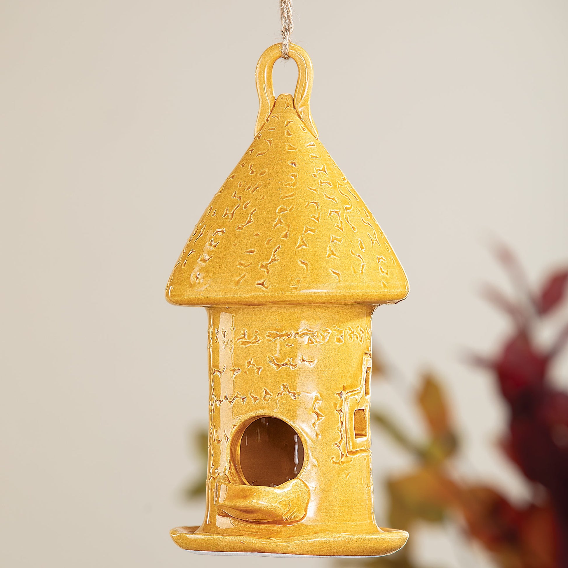 Our artisans of Italy handcraft this sunny yellow ceramic birdhouse. Birds can perch on the base, pop inside or feed on some seed. Includes a top loop for display. Approx. 12'' tall, 5.5'' dia.