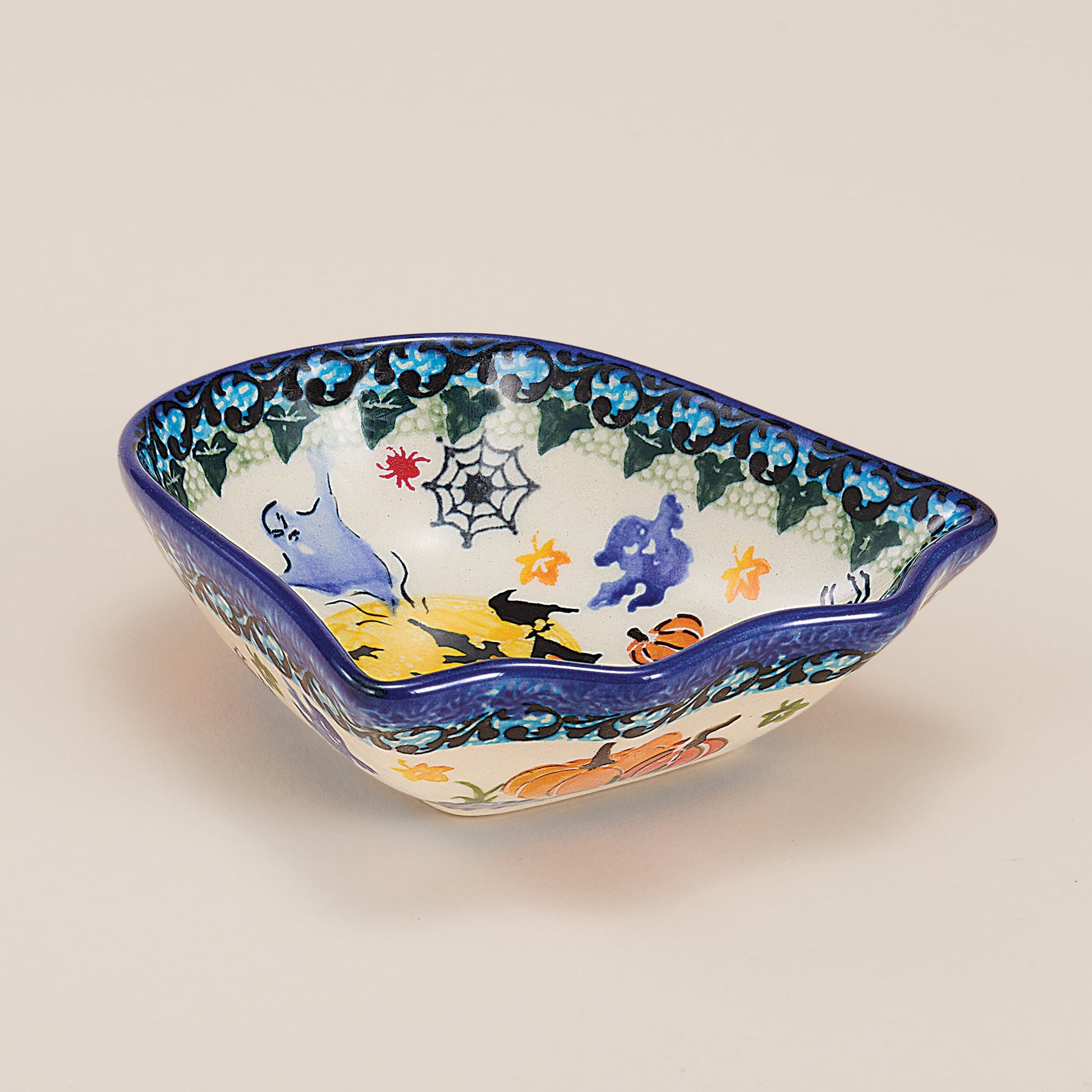 Skilled ceramicists and artisans Weronika & Jacek of Boleslawiec create this hand-painted design. Carved sponges are used to apply the larger motifs to this piece before fine brushwork accents each detail. This ghost-shaped bowl features spooky scarecrows, bats, cat wearing witch hat, ghouls, skeletons, flying witches, spiders, and more. Food, dishwasher and microwave safe. Handcrafted exclusively for Uno Alla Volta, from the hearts and hands of artisans. Approx. 4'' x 3''.
