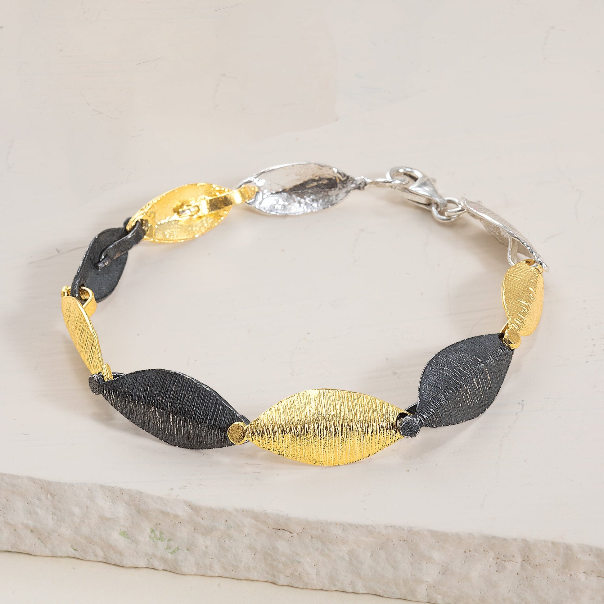 Our artisan, Avi of Israel, always inspired by the beauty of nature, handcrafts this tri-color leaf bracelet. He uses sterling silver and gold-plated metals as well as oxidized sterling to create this sleek, layered leaf design. Approx. 7.5'' long, lobster clasp.
