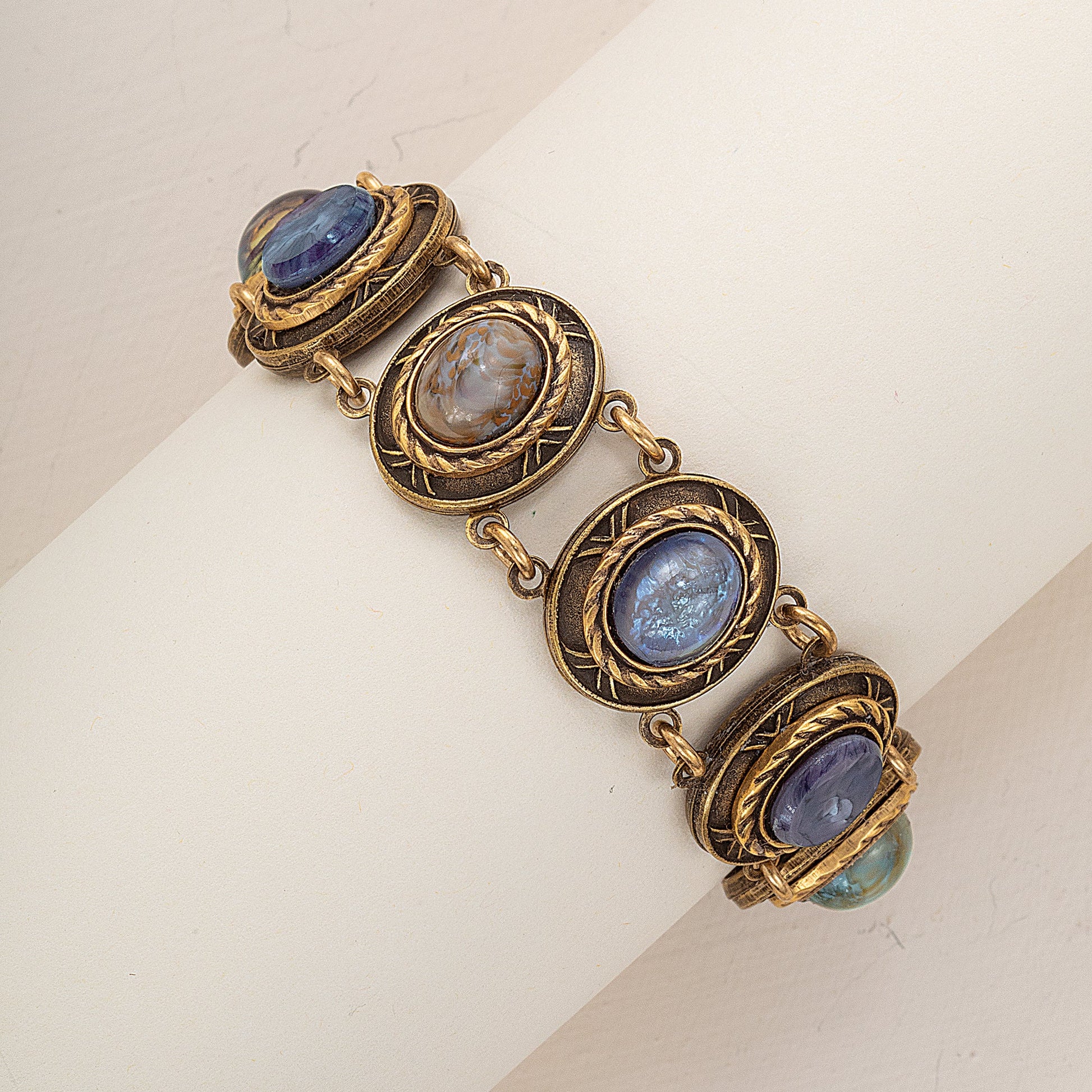 Artisan Patrice of Florida designs this link bracelet with vintage lilac Bavarian glass and faceted cabochons, set in 24k gold-plated and antiqued brass. Handcrafted exclusively for Uno Alla Volta, from the hearts and hands of artisans. Approx. 7'' long, toggle clasp.