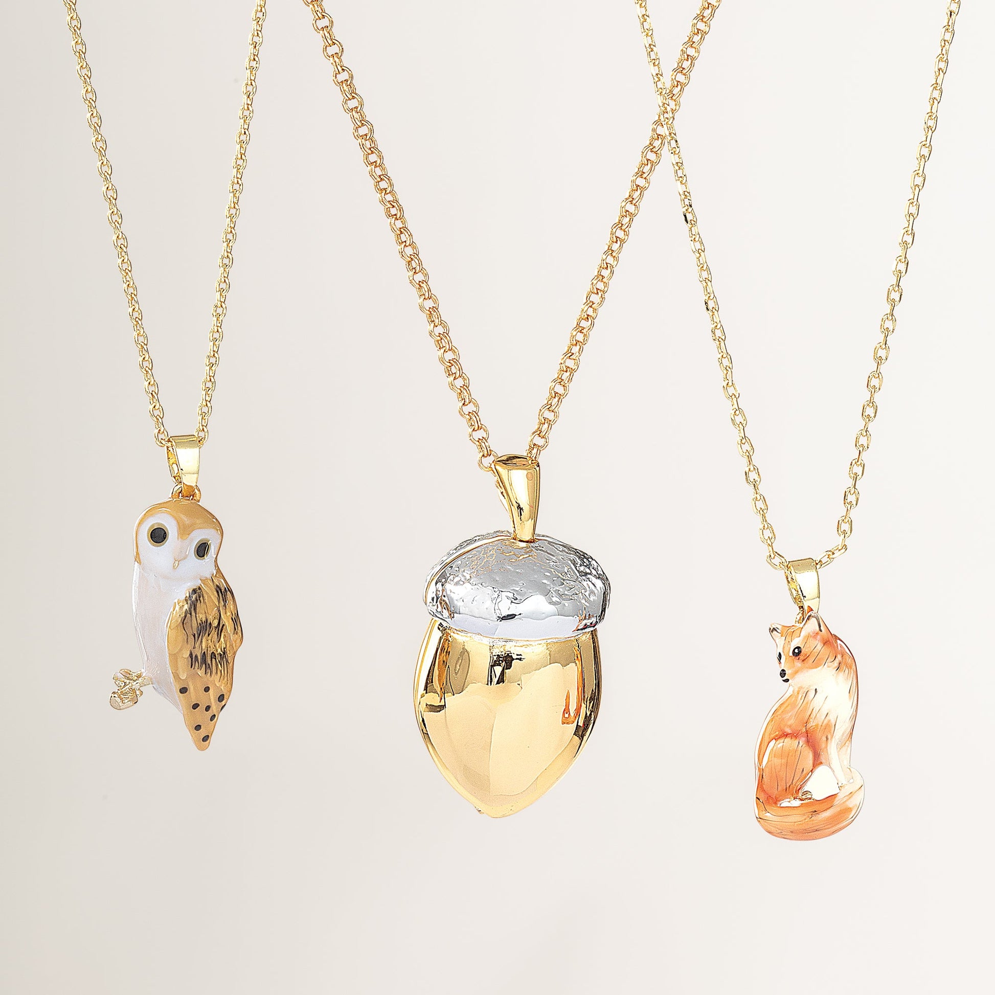 Artisan Bill of England creates this owl pendant necklace with exceptional and realistic details, and hand-painted with enamels and set in gold plated metal. Perfect for the nature lover. Approx. 16'' long, 2'' ext., 1'' pendant, lobster clasp.